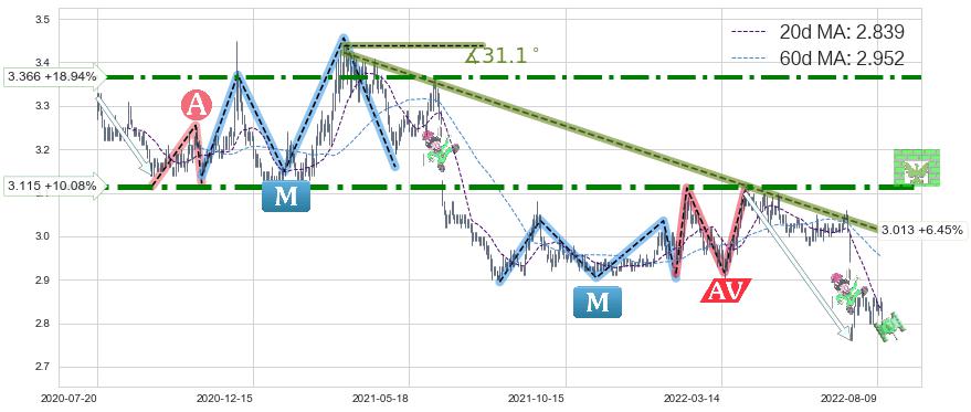 ♘ 阻力价格位3.115,可信任强度95.48%,距离最后交易2022-08-12形成的收盘价格2.830相差 +10.08%