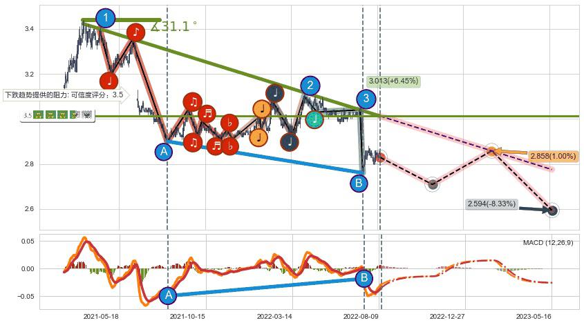 ♘ 在最后的下跌阶段2021-03-15至2022-08-11,存在 持续未破位的阻力位 ,阻力价格3.013,可信任强度80.92%,其距离最后价格2.830相差 +6.45%