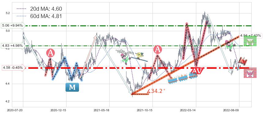 ♞ 20日均线:4.60,60日均线:4.81→ 快线<慢线