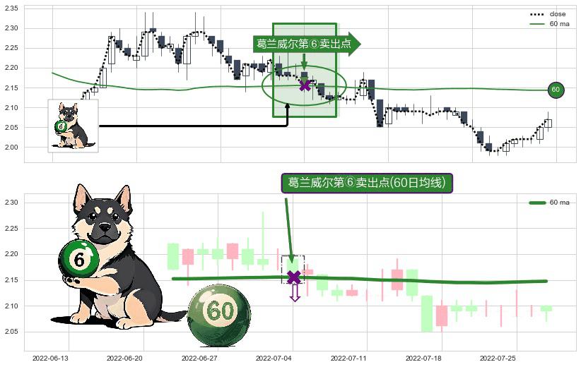 形态多维评估: ⚀ 2022-07-04-日显现 葛兰威尔均线 60日均线 第⑥卖出点 走势反转见顶信号,后市看跌,卖出信号