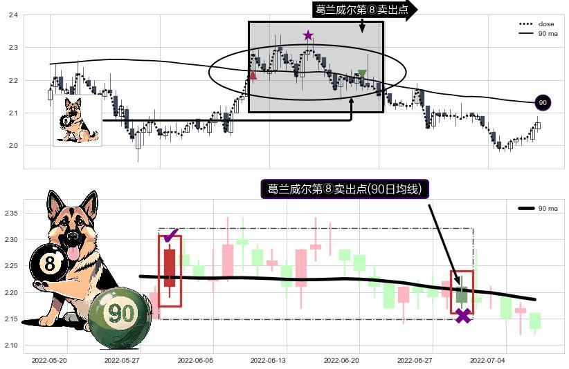 形态多维评估: ⚀ 2022-06-29-日显现 葛兰威尔均线 90日均线 第⑧卖出点 下降趋势的中继信号,后市看跌,卖出信号