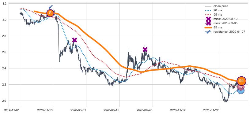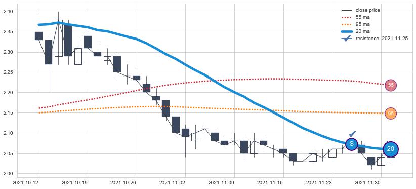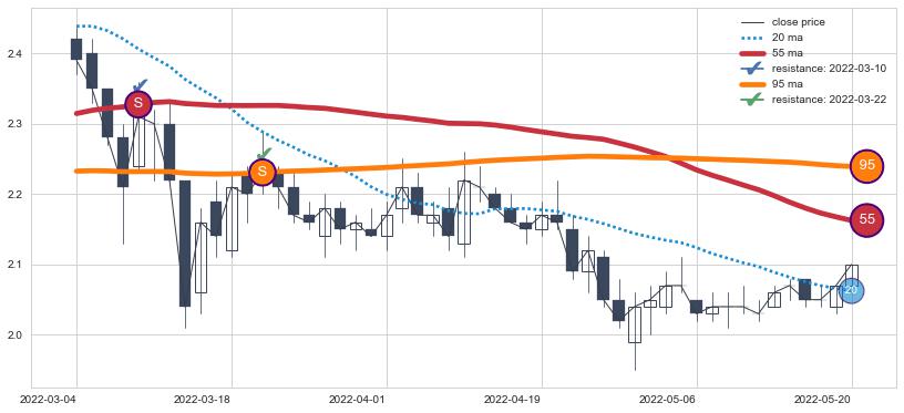 下跌趋势2022-03-04-2022-05-20,均线95, 55确认关键阻力2处