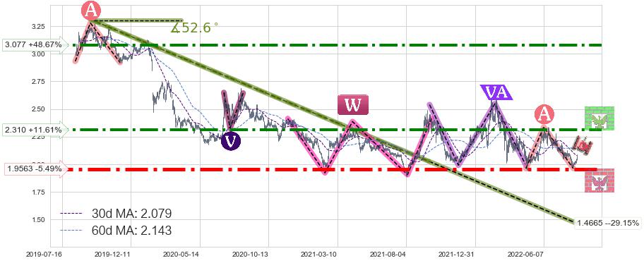♘ 阻力价格位2.310,可信任强度82.46%,距离最后交易2022-08-12形成的收盘价格2.070相差 +11.61%