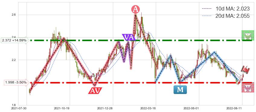 ♘ 支撑价格位1.998,可信任强度95.03%,距离最后交易2022-08-12形成的收盘价格2.070相差 -3.50%