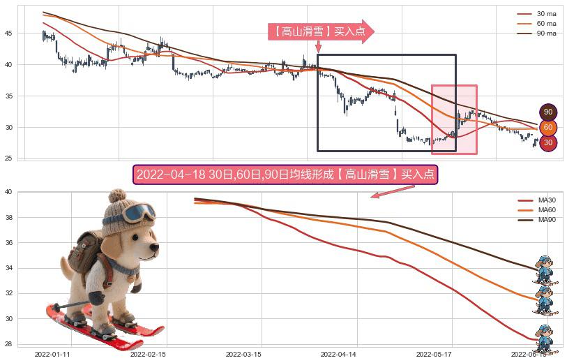 形态多维评估: ⚀ 2022-02-23日-2022-06-13日显现 30日-60日-90日均线 【高山滑雪】买入点 看多信号,后市看涨,买入