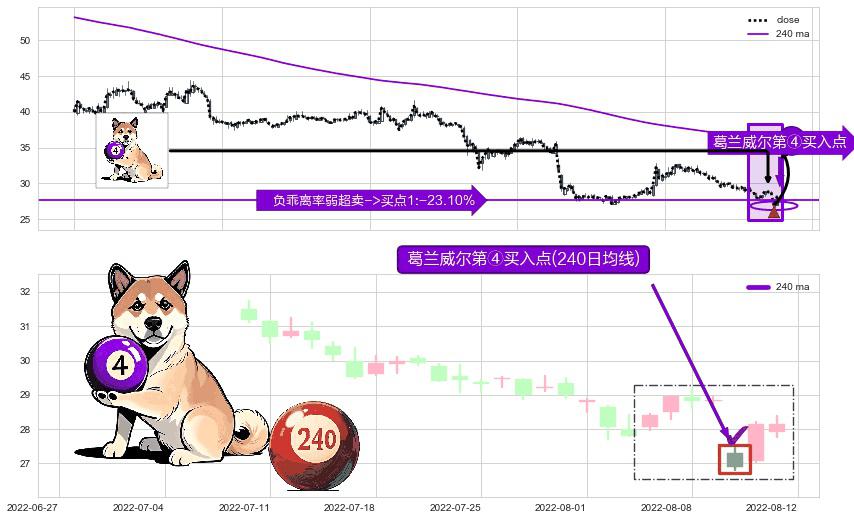 形态多维评估: ⚀ 2022-08-10-日显现 葛兰威尔均线 240日均线 第④买入点 下降趋势均值回复的短线反弹信号,后市看涨,买进信号