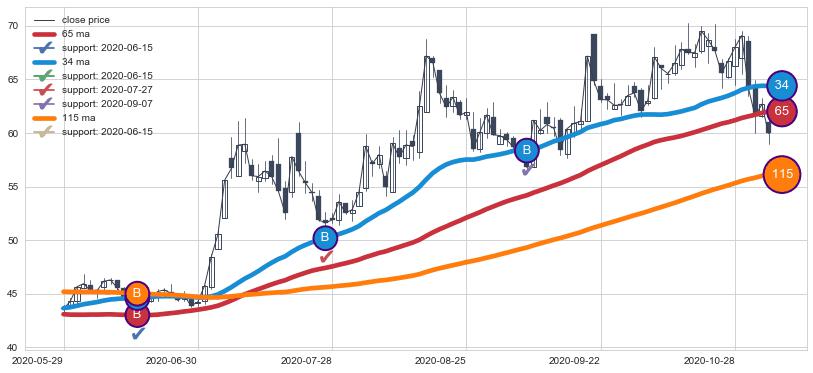 上涨趋势2020-05-29-2020-11-04,均线65, 34, 115确认关键支撑3处