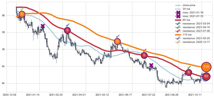下跌趋势2020-12-09-2021-10-12,均线65, 115确认关键阻力5处