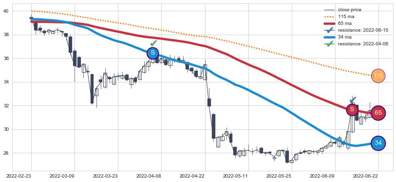 下跌趋势2022-02-23-2022-06-22,均线65, 34确认关键阻力2处