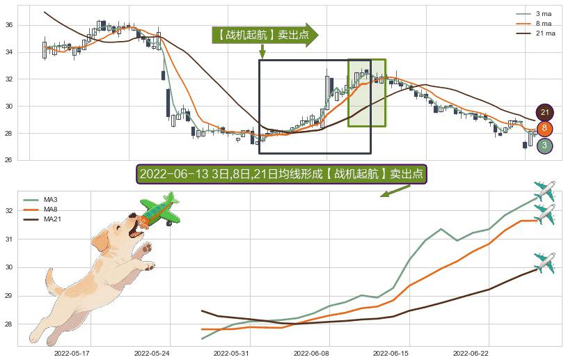 形态多维评估: ⚀ 2022-05-26日-2022-06-27日显现 3日-8日-21日均线 【战机起航】卖出点 看空信号,后市看跌,卖出