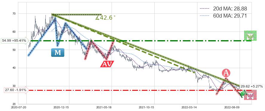 🦴 长线均值回复组合短线趋势跟踪[强阻力信号]2020-10-21-2022-08-12下跌趋势依然成立(下跌趋势跟踪依然存在),短线价格略微上行反弹(均值回复猜想),即将接近下跌趋势提供的未破位阻力价格:29.62。