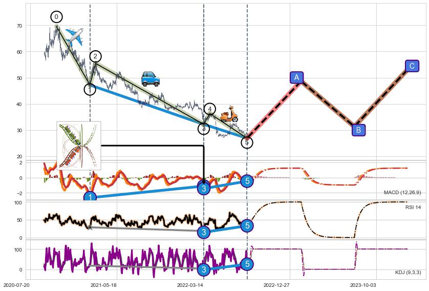 ➢ 1,3,5驱动浪MACD, RSI, KDJ走势都出现【常规背离】反转信号增强