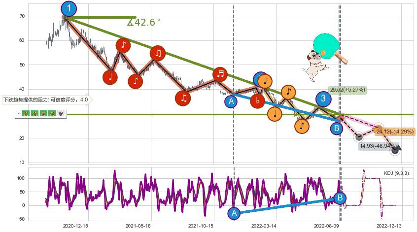 ♘ 在最后的下跌阶段2020-10-21至2022-08-12,存在 持续未破位的阻力位 ,阻力价格29.62,可信任强度83.86%,其距离最后价格28.14相差 +5.27%