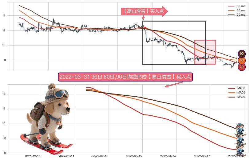 ⚀ 2022-01-20日-2022-06-09日显现 30日-60日-90日均线 【高山滑雪】买入点 看多信号,后市看涨,买入