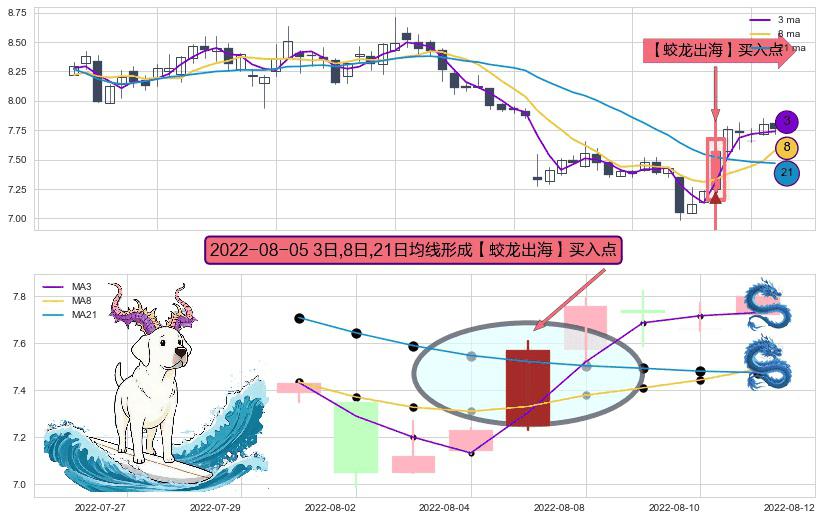 ⚀ 2022-08-05日显现 3日-8日-21日均线 【蛟龙出海】买入点 看多信号,后市看涨,买入