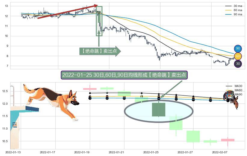 ⚀ 2022-01-25日显现 30日-60日-90日均线 【绝命跳】卖出点 看空信号,后市看跌,卖出
