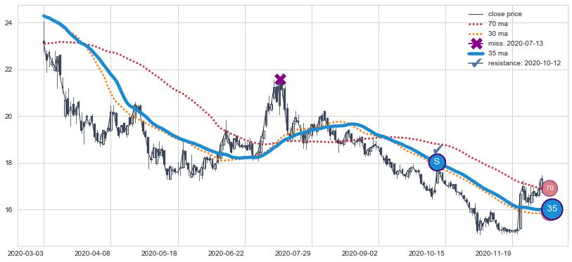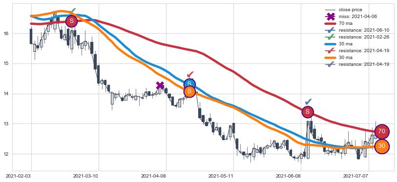 ⚄ 均线向上突破后价格上探力度高,正乖离率高,再次向下破位后维持原均线下跌趋势【弱】
