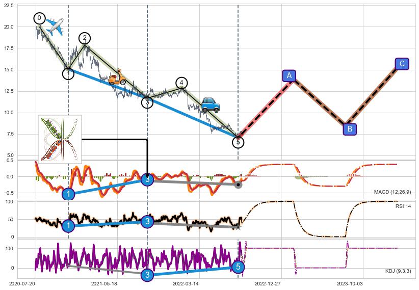 ➢ 1,3,5驱动浪MACD, RSI, KDJ走势都出现【常规背离】反转信号增强