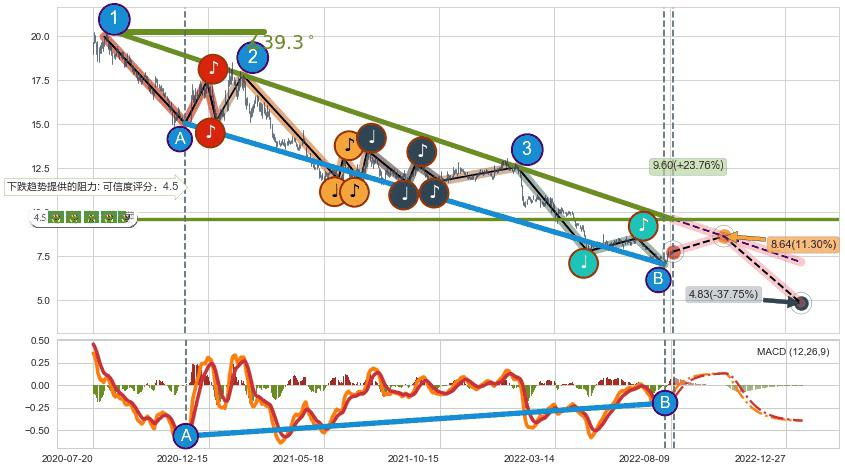 ♘ 在最后的下跌阶段2020-08-03至2022-08-12,存在 持续未破位的阻力位 ,阻力价格9.60,可信任强度88.10%,其距离最后价格7.76相差 +23.76%