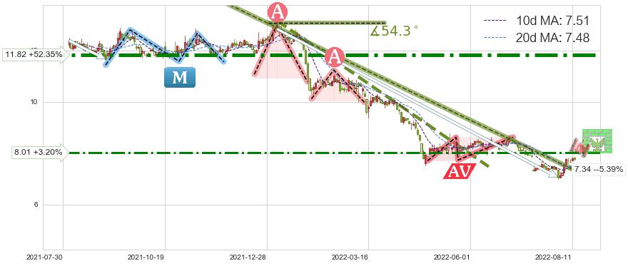 ♘ 阻力价格位11.82,可信任强度96.97%,距离最后交易2022-08-12形成的收盘价格7.76相差 +52.35%