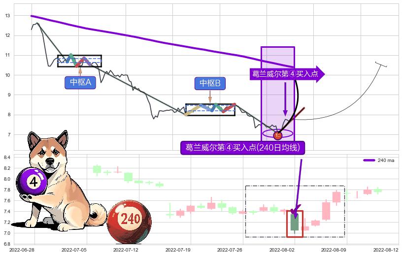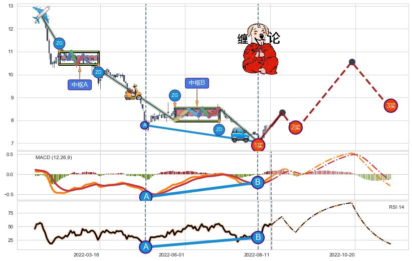 ➣ 【中枢B】:2022-05-24-2022-06-30,中枢由6笔构成,共27交易日, ZG=8.47, ZD=8.20