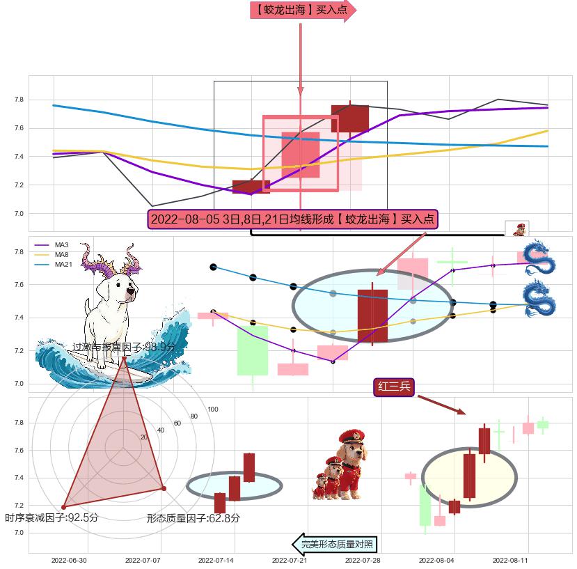 | 4 🅚:【蛟龙出海】买入点 ➕ ☯️:缠论买卖点下降缠中枢AB形成后猜想拐点1买已到达,猜想后续持续拉升(均值回复) ☞ 看多信号 ⇥ 【均线】交织【图形】⇥ 综合量化分数: 80 | > |