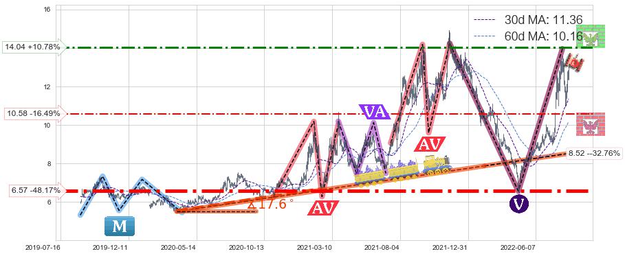 ♘ 支撑价格位10.58,可信任强度49.25%,距离最后交易2022-08-12形成的收盘价格12.67相差 -16.49%