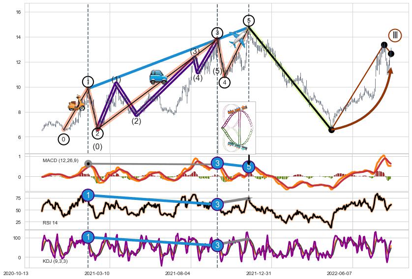 ➣ 1,3,5驱动浪MACD, RSI, KDJ走势都出现【常规背离】反转信号增强