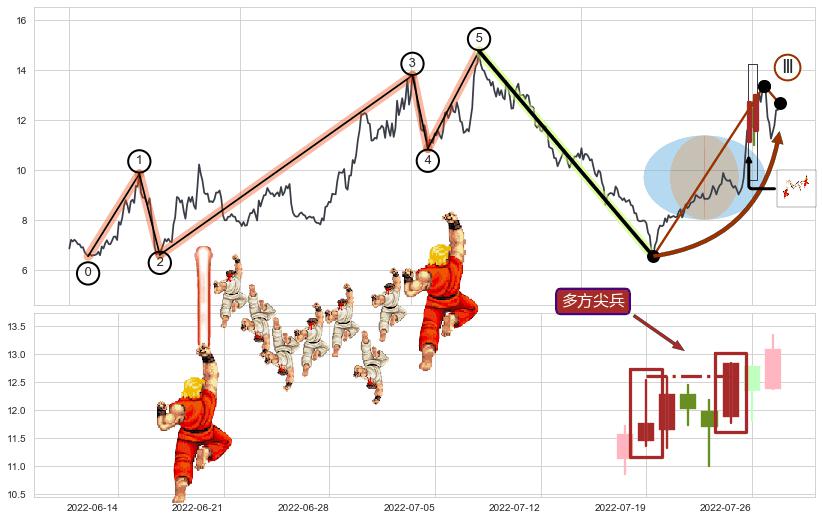 | 5 🅚:中流砥柱形态 ➕ 🌊:波浪理论上涨5浪延续:猜想C点强支撑小回调终止,猜想保持上涨5浪方向拉升(均值回复后大周期继续趋势跟踪) ☞ 看多信号 ⇥ 【🅚线】交织【图形】⇥ 综合量化分数: 58 | > |
