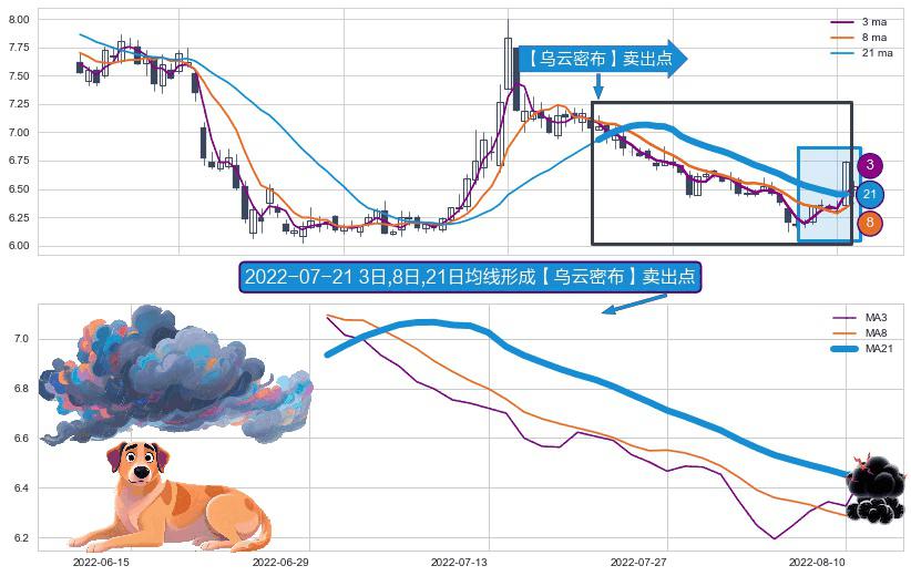 形态多维评估: ⚀ 2022-06-30日-2022-08-11日显现 3日-8日-21日均线 【乌云密布】卖出点 看空信号,后市看跌,卖出