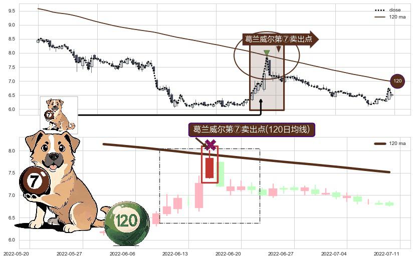 形态多维评估: ⚀ 2022-06-15-日显现 葛兰威尔均线 120日均线 第⑦卖出点 下降趋势的中继信号,后市看跌,卖出信号