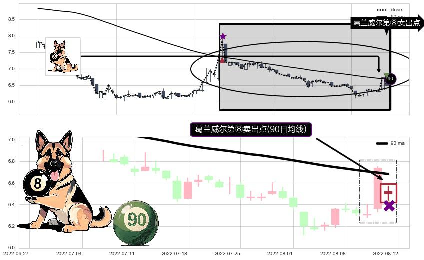 形态多维评估: ⚀ 2022-08-12-日显现 葛兰威尔均线 90日均线 第⑧卖出点 下降趋势的中继信号,后市看跌,卖出信号