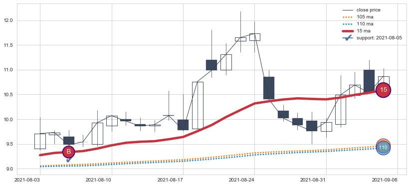 上涨趋势2021-08-03-2021-09-06,均线15确认关键支撑1处