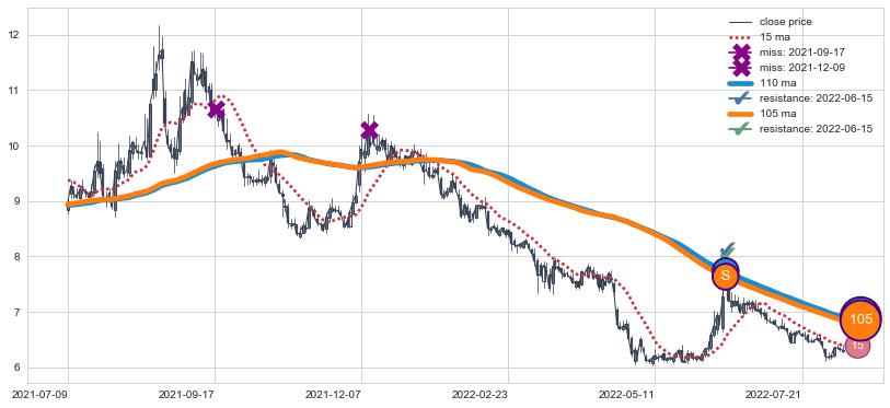 下跌趋势2021-07-09-2022-08-10,均线105, 110确认关键阻力1处