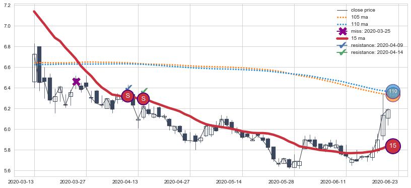 下跌趋势2020-03-13-2020-06-23,均线15确认关键阻力2处