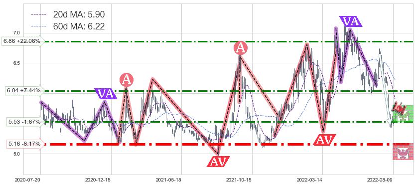 ♘ 阻力价格位5.53,可信任强度57.22%,距离最后交易2022-08-12形成的收盘价格5.62相差 -1.67%