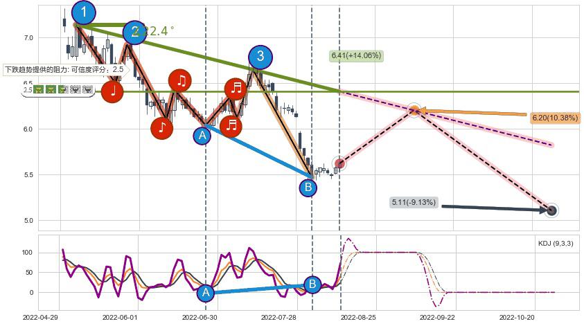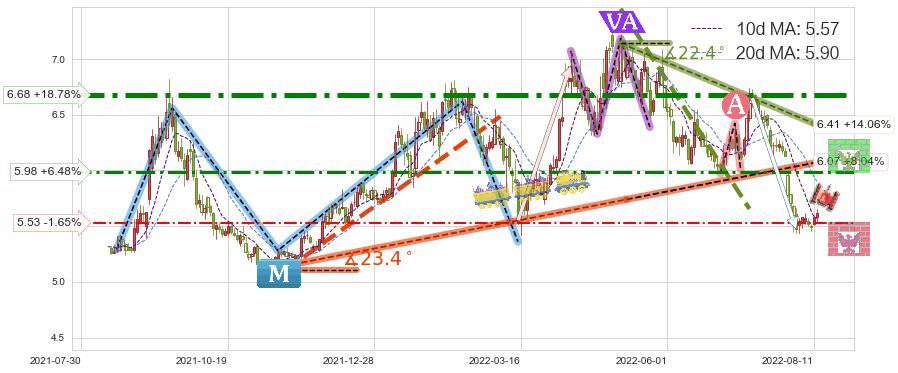♘ 阻力价格位5.98,可信任强度55.54%,距离最后交易2022-08-12形成的收盘价格5.62相差 +6.48%