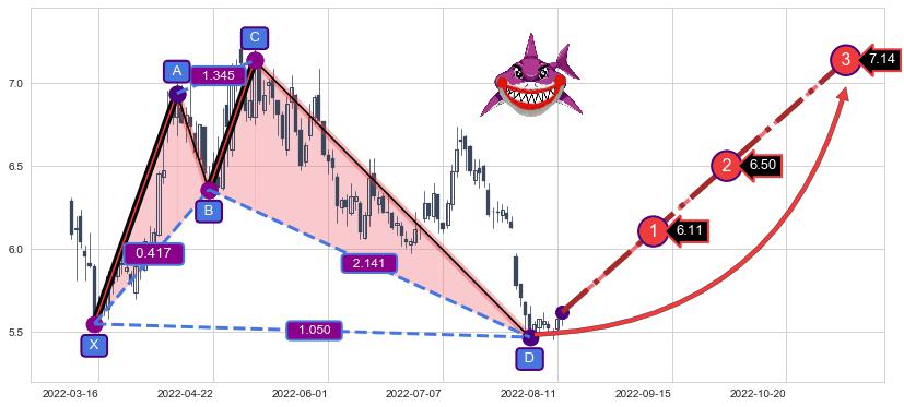 ➣ 已完成【鲨鱼】形态起点X: 2022-03-15, 终点D: 2022-08-03, 共96交易日