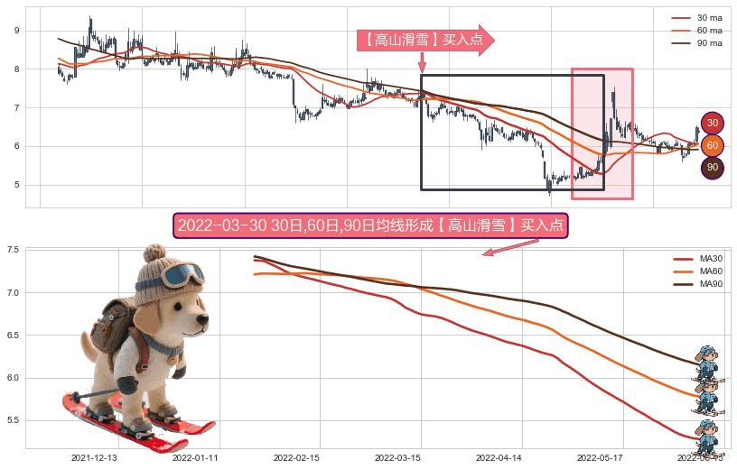 ⚀ 2022-01-20日-2022-06-08日显现 30日-60日-90日均线 【高山滑雪】买入点 看多信号,后市看涨,买入