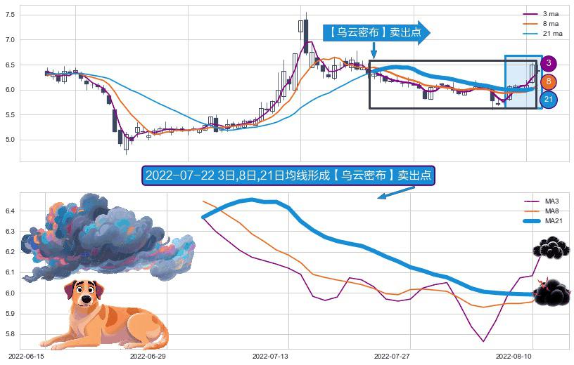 ⚀ 2022-07-04日-2022-08-11日显现 3日-8日-21日均线 【乌云密布】卖出点 看空信号,后市看跌,卖出