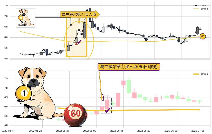 ⚀ 2022-06-09-日显现 葛兰威尔均线 60日均线 第买①入点 走势反转见底信号,后市看涨,买进信号