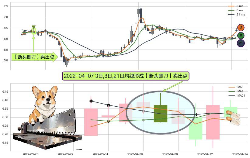 ⚀ 2022-04-07日显现 3日-8日-21日均线 【断头铡刀】卖出点 看空信号,后市看跌,卖出