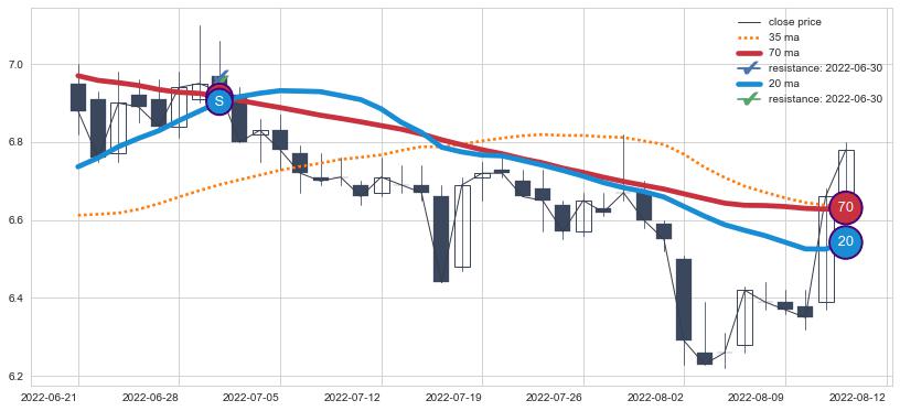 下跌趋势2022-06-21-2022-08-12,均线20, 70确认关键阻力1处