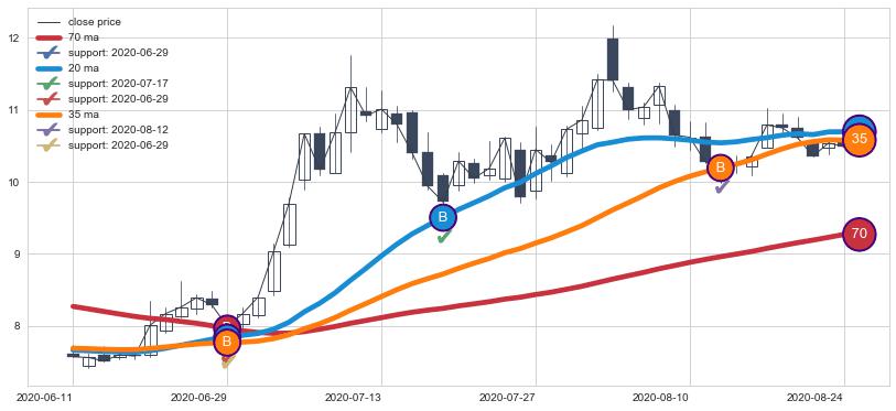 上涨趋势2020-06-11-2020-08-24,均线35, 20, 70确认关键支撑3处