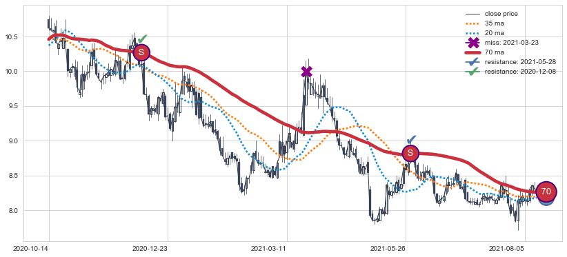 下跌趋势2020-10-14-2021-08-12,均线70确认关键阻力2处