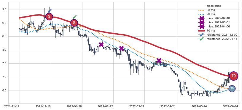 下跌趋势2021-11-12-2022-06-14,均线70确认关键阻力2处