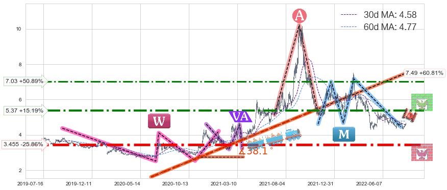 ♘ 阻力价格位7.03,可信任强度69.12%,距离最后交易2022-08-12形成的收盘价格4.66相差 +50.89%