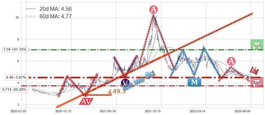 ♘ 支撑价格位3.714,可信任强度69.81%,距离最后交易2022-08-12形成的收盘价格4.66相差 -20.29%