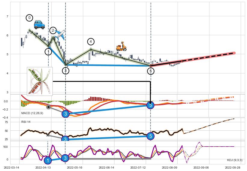 ➢ 1,3,5驱动浪MACD, RSI, KDJ走势都出现【常规背离】反转信号增强