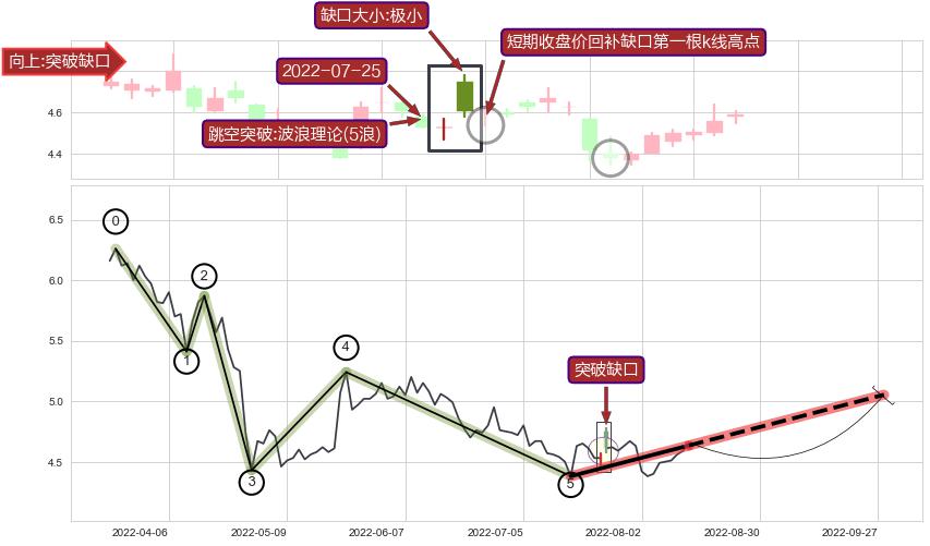 ➣ 突破缺口形成后,后续k已经超过14根,跳空突破波浪理论(5浪)关键点后, 出现【轻微回踩】迹象,短期低点影线回补缺口第二根k线低点